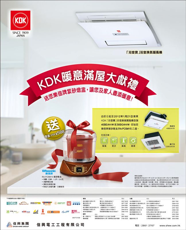 由即日起至2012年1月21日購買KDK「浴室寶」浴室換氣暖風機型號40BEAH/W 或30BGAH/W,即送您樂信牌紫砂燉盅 (RA-PCSM15)乙個。