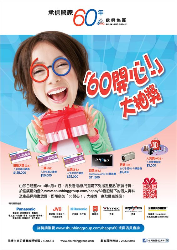 Buy any official designated Rasonic Air Conditioners/ Washing Machines or KDK Electric Fans in the period of 1st June to 31st August, 2013 in Hong Kong/ Macau, you are entitled to enter the Shun Hing Group's "Happy 60!" Lucky Draw. Simply register at http://www.shunhinggroup.com/happy60 until 30th September, 2013.