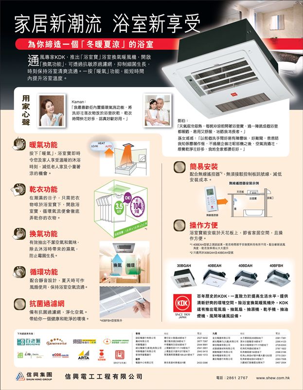 KDK latest model of "Mini" Bathroom Thermo Ventilator of KDK (30BGAH), which unifies the function of Heating, Clothes Drying, Ventilation and Circulation. Equipped with high technological PTC (Positive Temperature Coefficient) characteristics - ceramic semi-conductor heating element, it can instantly warm up the bathroom. The circulation of airflow helps you to dry clothes even in high humidity days. It's sirocco fan can exhaust odor from the bathroom efficiently. Its' Wireless Remote Controller also enables easy installation and operation. With these warm-hearted functions, KDK Bathroom Thermo Ventilator brings you a clear and fresh bathroom experiences throughout the year.