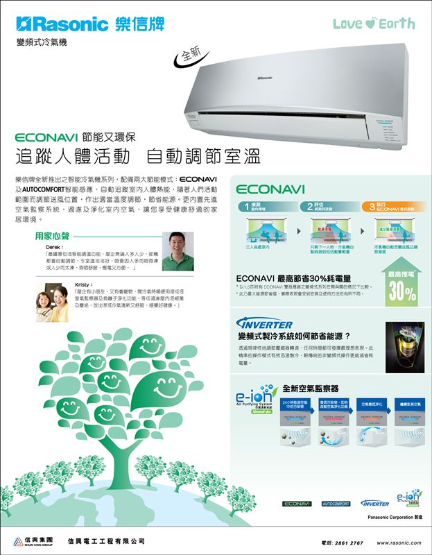 The brand new Rasonic Inverter Spilt Type air conditioners are equipped with ECONAVI energy saving mode and AUTOCOMFORT mode. Furnished with infrared sensor to detect people's movements by area search, activity detection and absence detection, this new technology can adjust the room temperature and wind blowing direction automatically. Combining with the advanced e-ion air purifying system which brings you the most comfortable indoor living experience.
