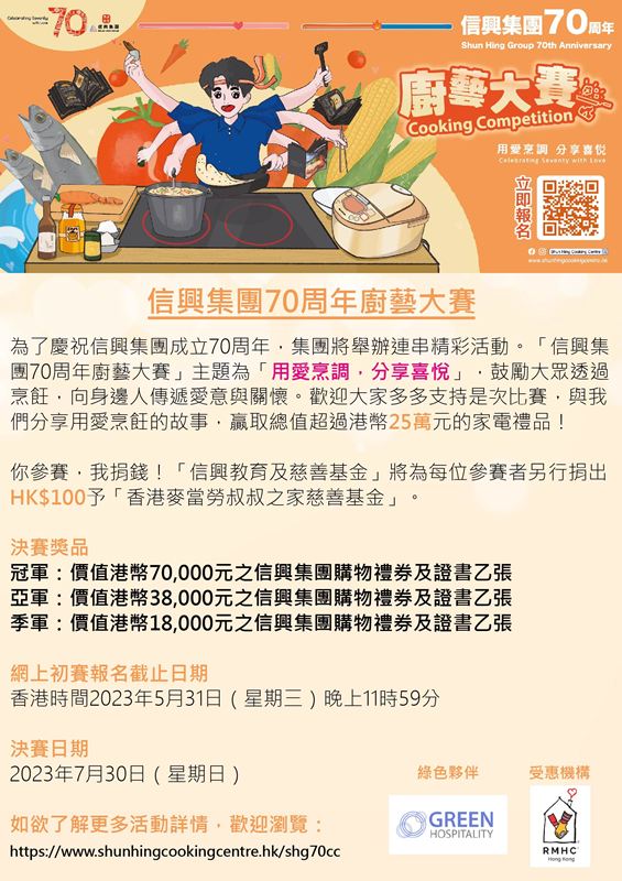 With the theme "Celebrating Seventy with Love", Shun Hing Group 70th Anniversary Cooking Competition encourages the public to cook a special meal and create unforgettable memories with their loved ones.