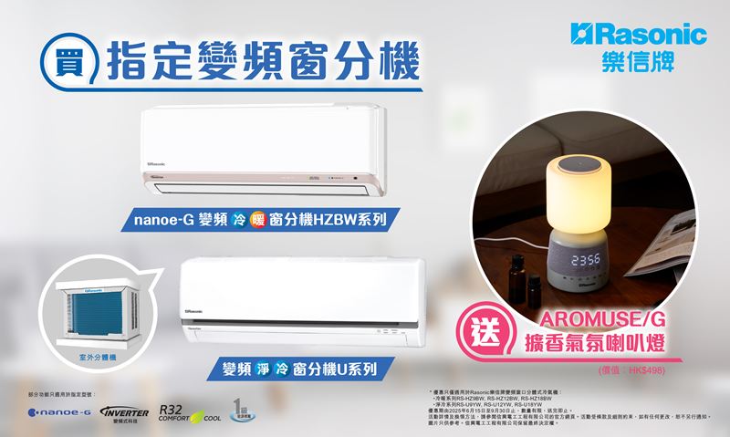 During the promotion period, purchase the following specified models of Rasonic Inverter Window Split Type Air Conditioner* can entitle a Rasonic Aroma Mood Light Speaker (AROMUSE/G) free, worth HK$498. While stocks last. (Only applicable to Hong Kong retailers)